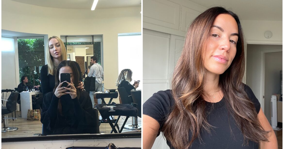 In order to make it work for me, Henty gave me a dry cut so she could see how my hair would fall. “For the cut we really want to get that signature Topanga vibe we’ve all seen on TikTok, so we’re taking about two and a half inches off of the length, which will make it more blunt and make everything look a lot more full,” Henty says. She also cleaned up my face-framing layers as well as the ones all around my head, so I would have lots of movement.