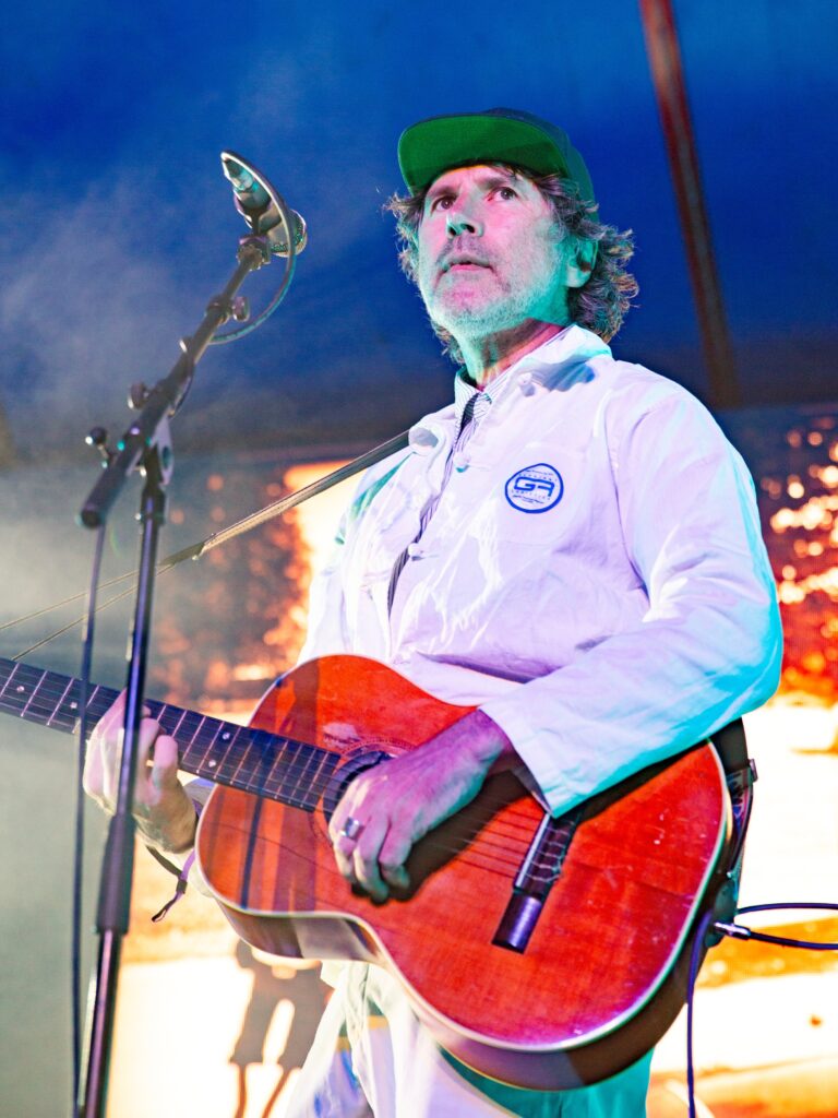 Schroff Rhys est la dernière tête d'affiche de LLWYN ISAF et offre une performance idiosyncrasique typique – les signes en gallois et une représentation visuelle attrayante de son album de 2014 Intérieur américain. Ce jour-là, Rhys avait présenté son film du même nom au Film Festival, qui est parallèle à la musique.