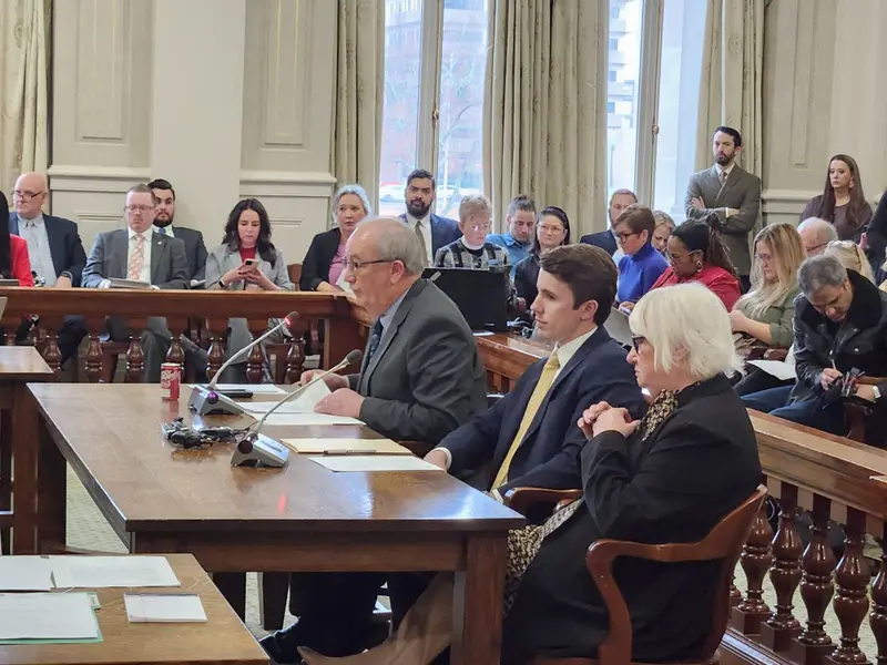 Republican Sen. Kim Hammer, left of center, answers questions about proposed laws that would alter the citizen-initiated ballot measure process during an Arkansas Senate committee hearing in February.