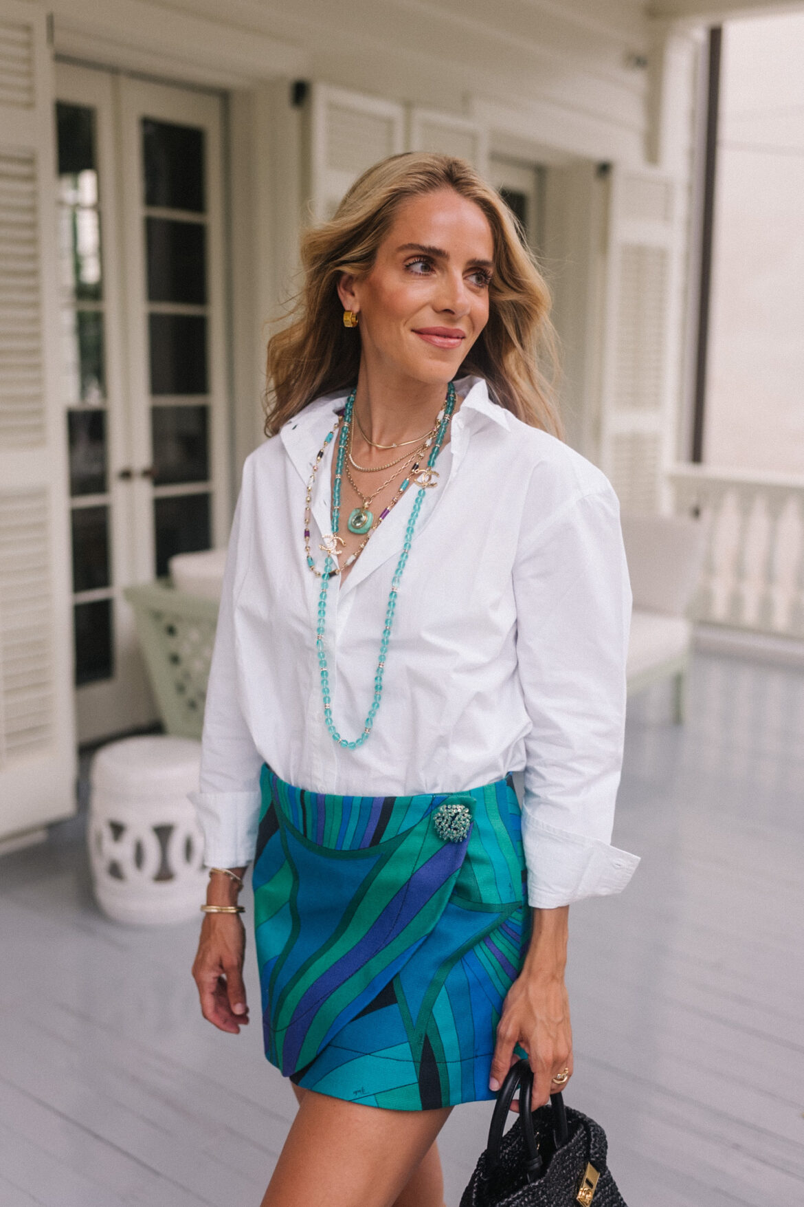 Julia Amory Top, Pucci -Rock, Hermes Sandals, Ferragamo Bag, Chanel & Retrouvai -Hall Chains (similaire ici et ici)