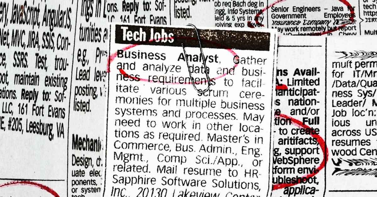 First, I drove to the address given for one of the employers, Sapphire Software Solutions, whose ad said it was looking for someone to “gather and analyze data and business requirements to facilitate various scrum ceremonies for multiple business systems and processes.” I arrived at an office building in Ashburn, Virginia, near Dulles International Airport. But the receptionist in the appointed suite looked confused when I asked for Sapphire.