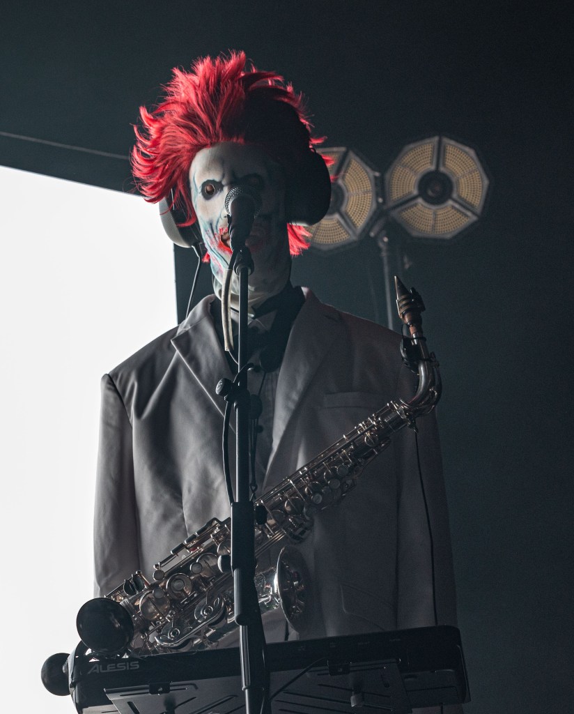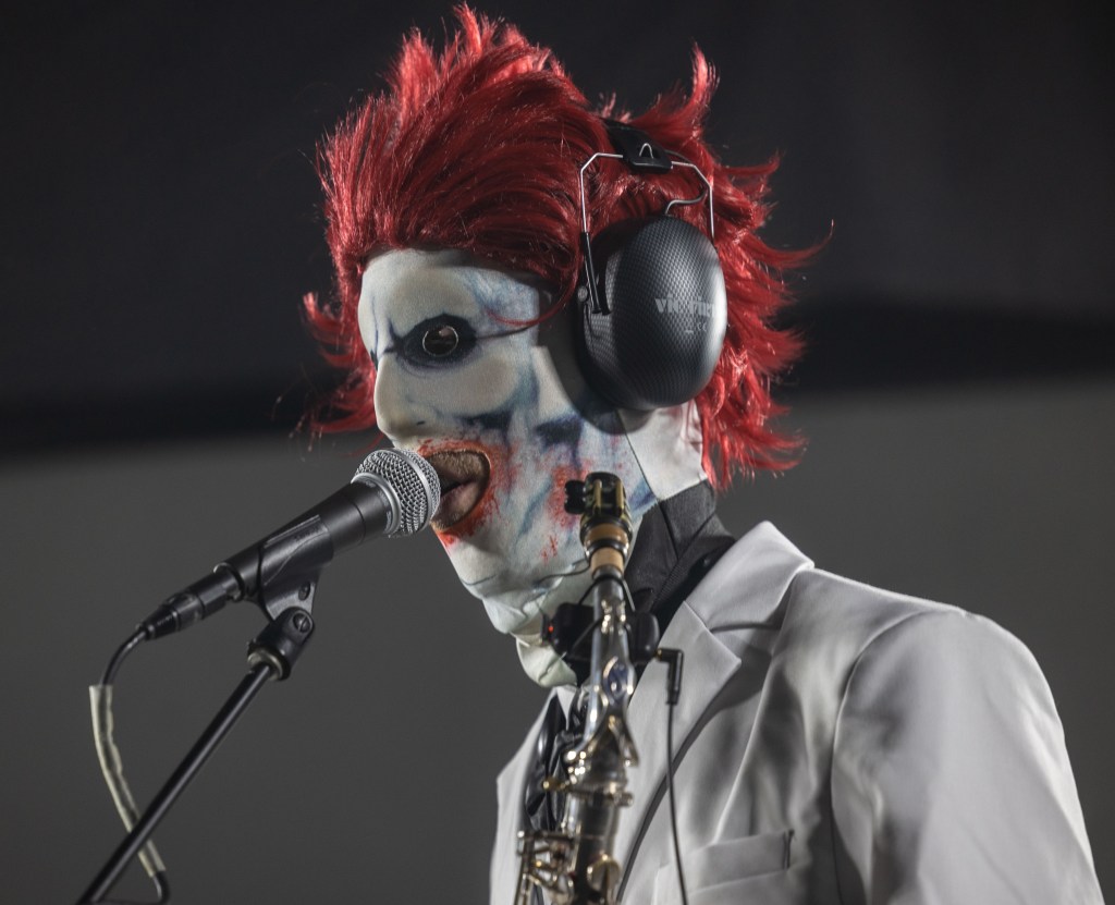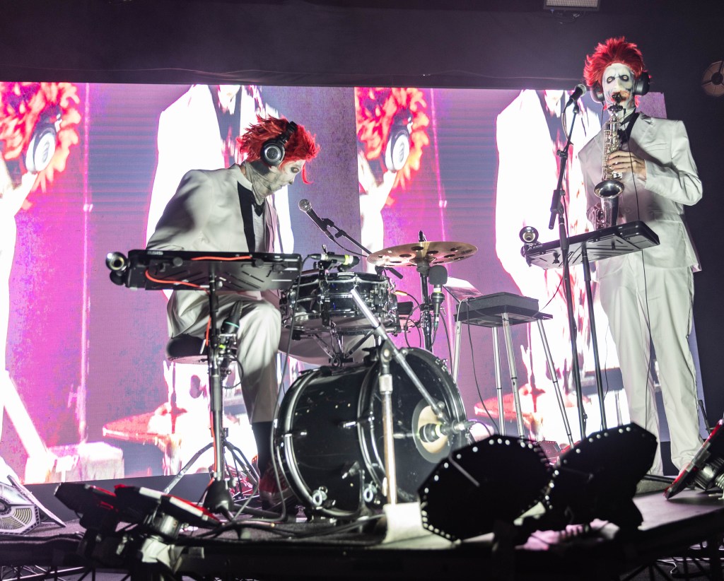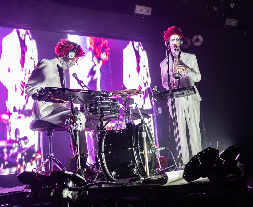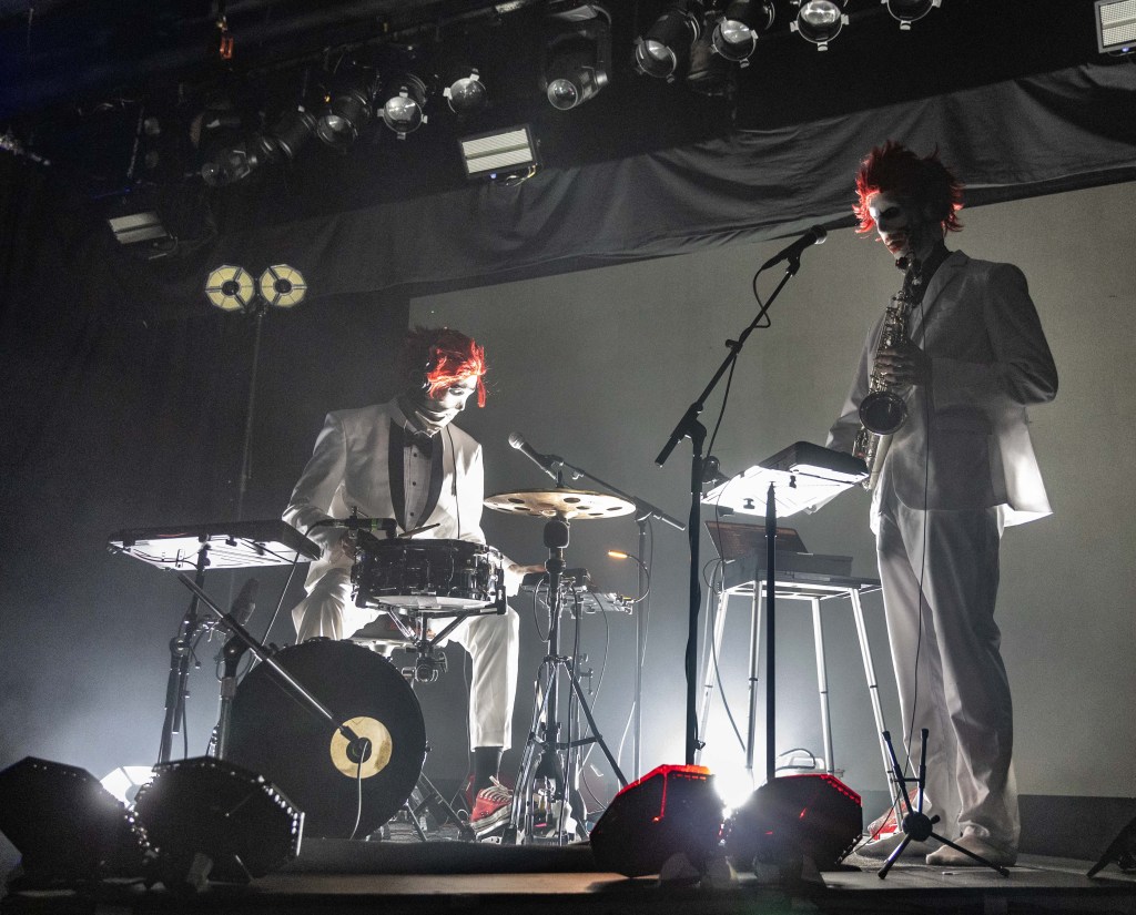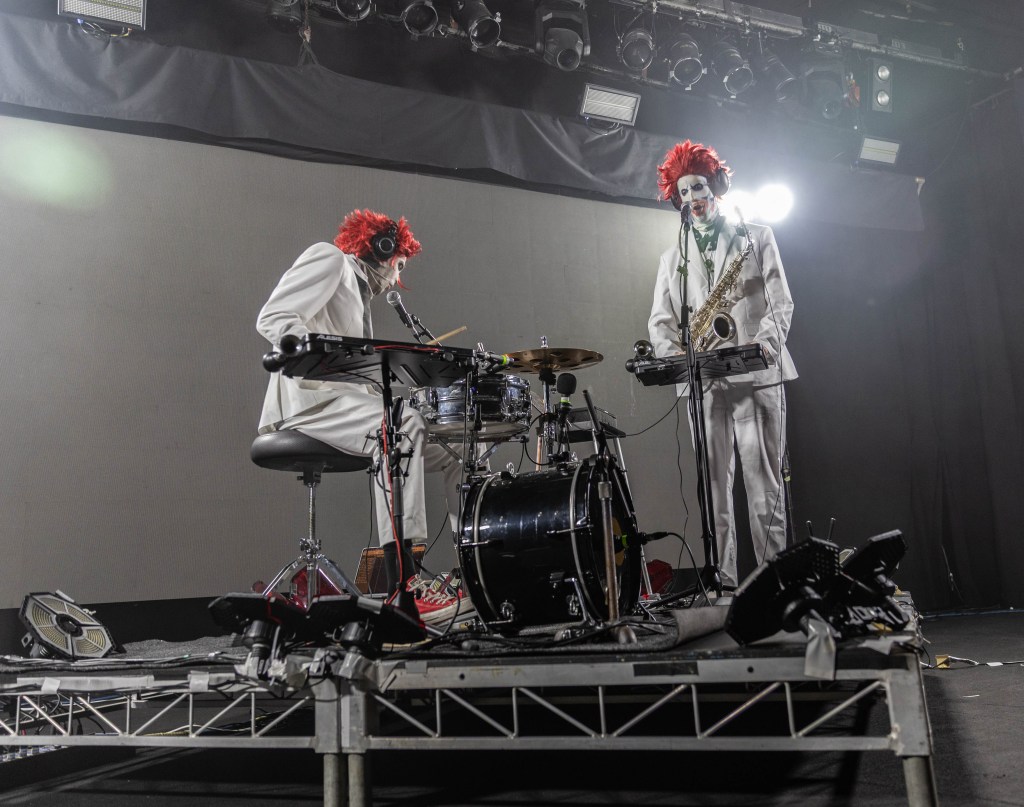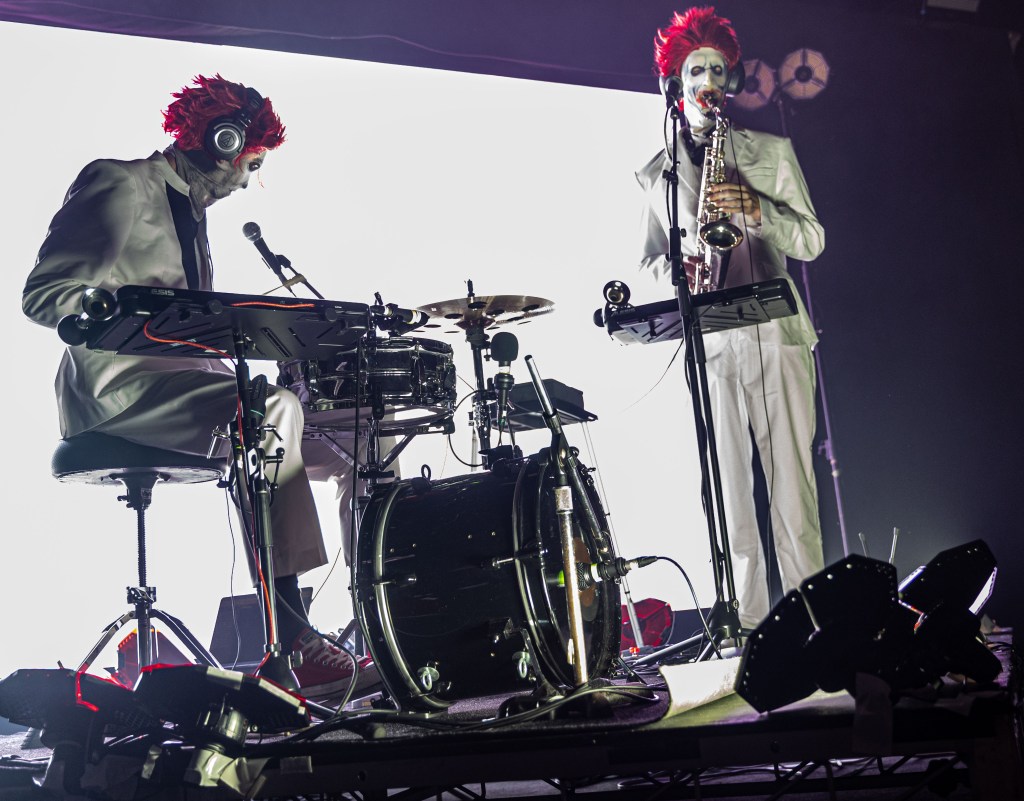 Clown Core entre dans la scène et est en silence pendant quelques instants, apparemment la foule derrière eux, tandis qu'un écran clignote des avertissements: “Conseils des parents”, “avertissement de crise”. Ensuite, des trucs en action sans avertissement réel. Le fond change pour tourner les images de l'espace et des vues par satellite de la terre. Il s'agit de deux garçons surréaliste dans des masques de clown, l'un sur Sax, l'autre derrière un kit de batterie qui déchaîne une tempête de métal et du jazz densément blessé, qui est parsemée de sommets de clown grinçants. Je devrais prendre des photos, mais plus d'une fois, je me faisais silencieux lentille et j'essaie de traiter ce que je vois. C'est l'art de la performance sur MEME Core et c'est merveilleux.