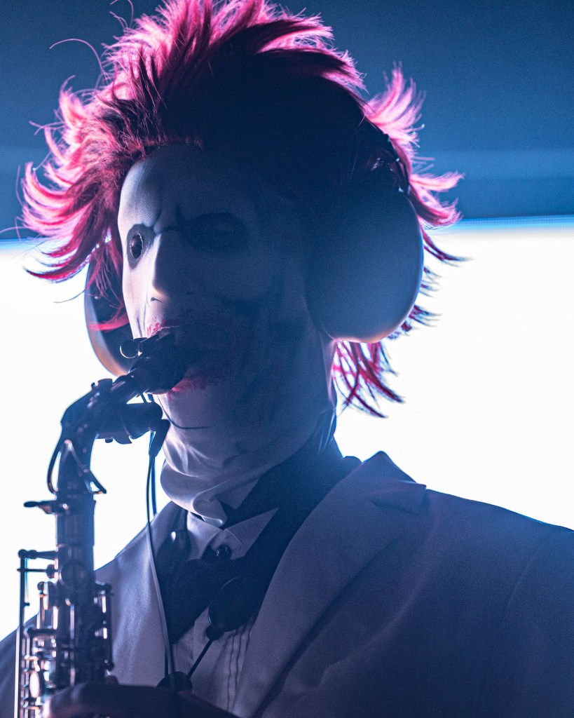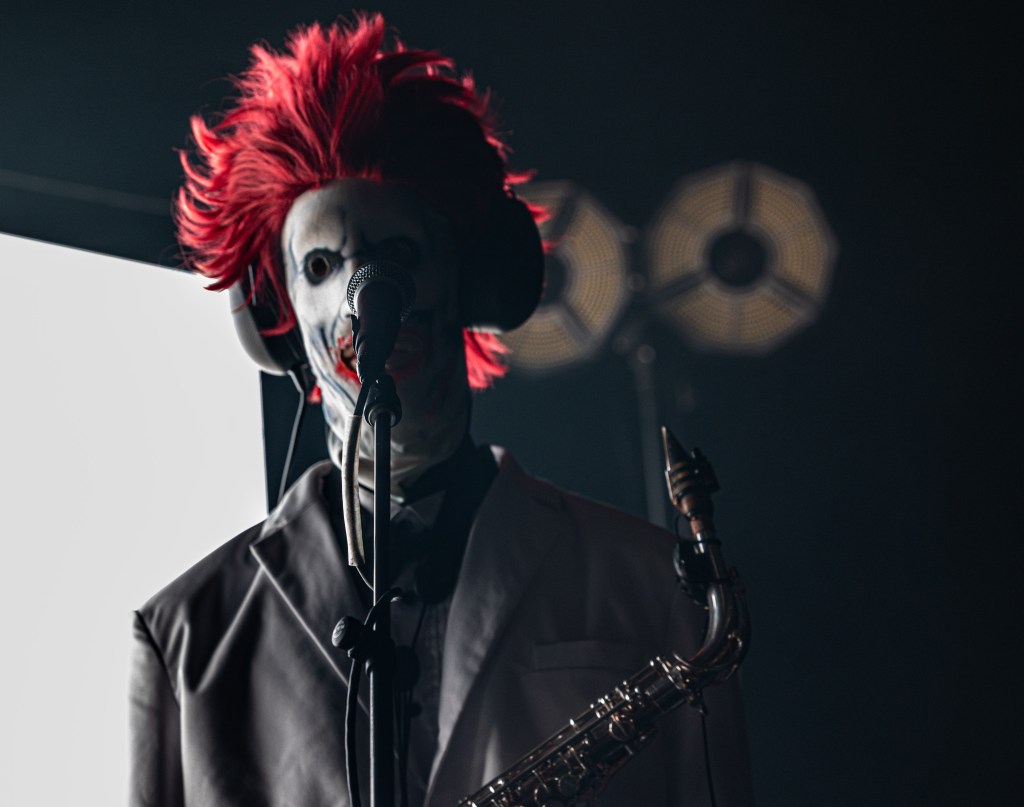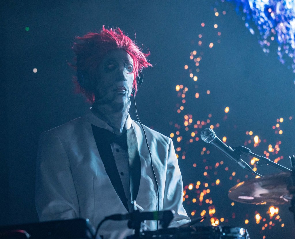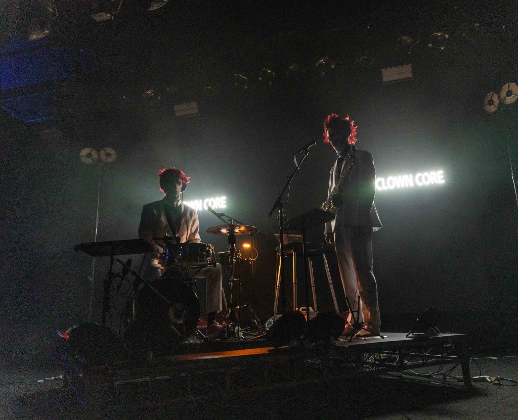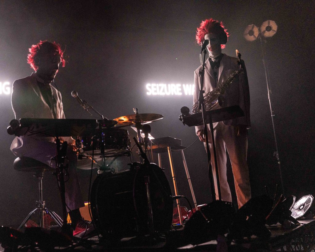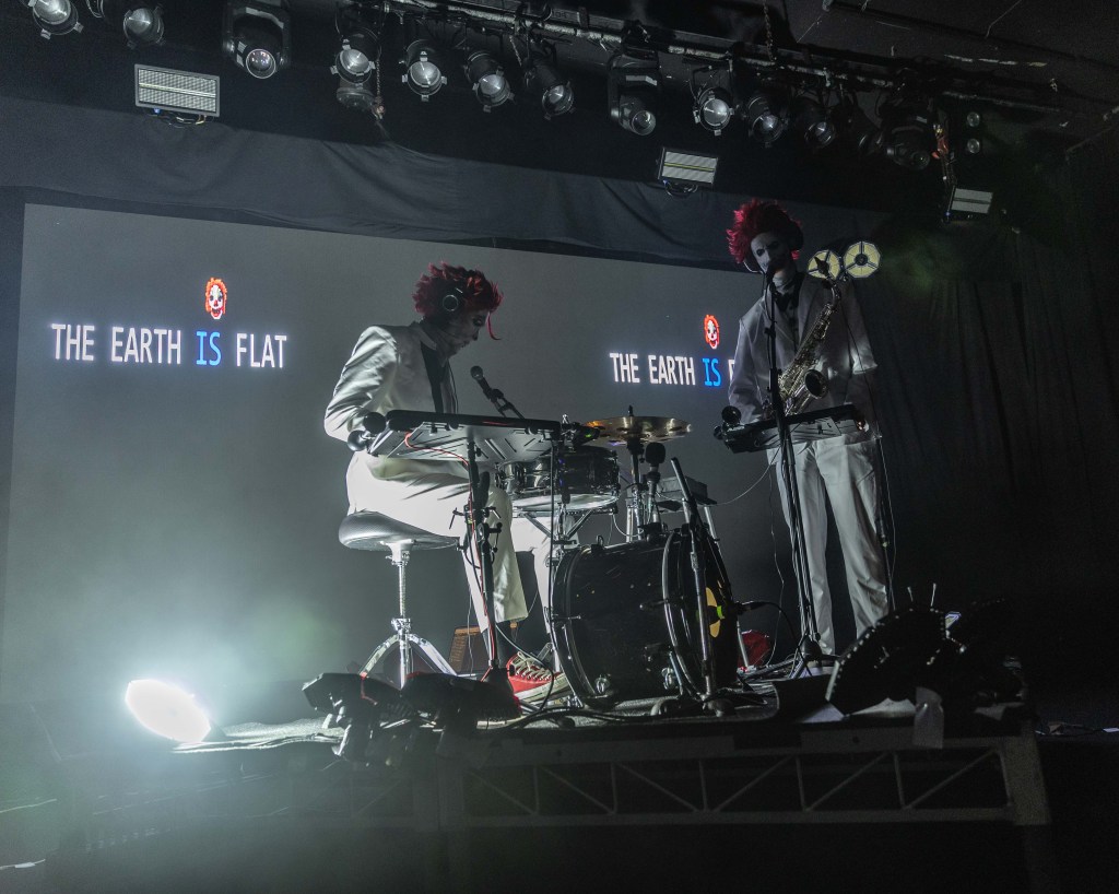 Clown Core entre dans la scène et est en silence pendant quelques instants, apparemment la foule derrière eux, tandis qu'un écran clignote des avertissements: “Conseils des parents”, “avertissement de crise”. Ensuite, des trucs en action sans avertissement réel. Le fond change pour tourner les images de l'espace et des vues par satellite de la terre. Il s'agit de deux garçons surréaliste dans des masques de clown, l'un sur Sax, l'autre derrière un kit de batterie qui déchaîne une tempête de métal et du jazz densément blessé, qui est parsemée de sommets de clown grinçants. Je devrais prendre des photos, mais plus d'une fois, je me faisais silencieux lentille et j'essaie de traiter ce que je vois. C'est l'art de la performance sur MEME Core et c'est merveilleux.