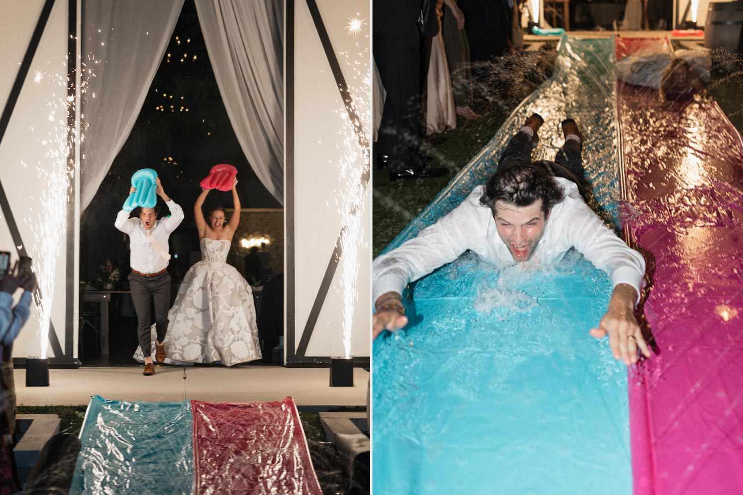 Lorsque leurs invités ont lâché la piste de danse, la mariée et le marié se sont glissés pour retourner dehors et prêts à fouetter une diapositive lisse et imbibée de l'eau, qui a été mise en place.