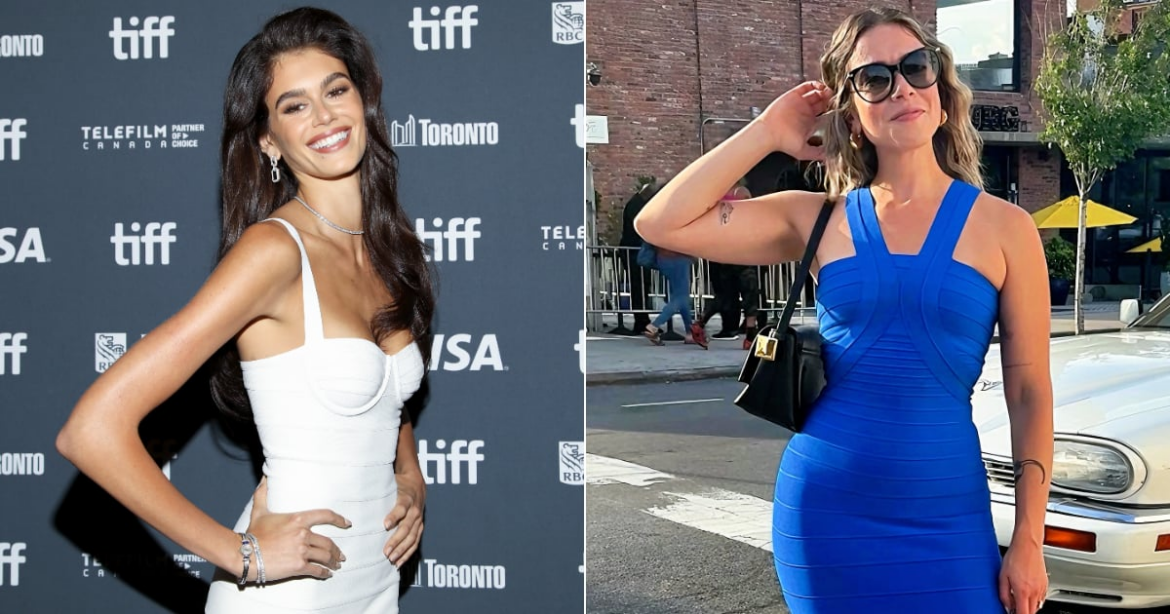 And maybe that’s why, 20 years later, I was apprehensive to try a trend that used to keep me up at night. A familiar sense of fear creeped over me as I pulled the Hervé Léger Elise Dress ($690) over my head and procrastinated peering into the mirror. Would I like the shape of my thighs? Would I be able to make out my period bloat belly straight-on, before even turning to the side? All the same ridiculous questions popped into my head as I asked myself why I signed up to try the skintight silhouette that’s enjoying a resurgence thanks to models like Kaia Gerber and Hailey Bieber.