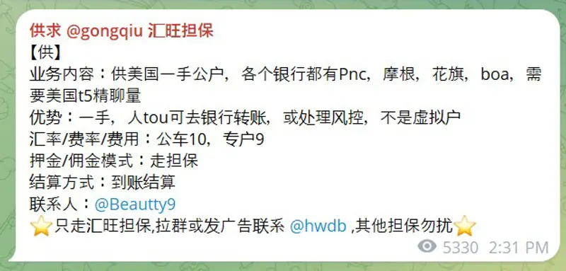- Black Market Bank Accounts: Chinese-language Telegram channels offer to rent U.S. bank accounts to pig-butchering scammers, who use the accounts to move victims’ cash into crypto.