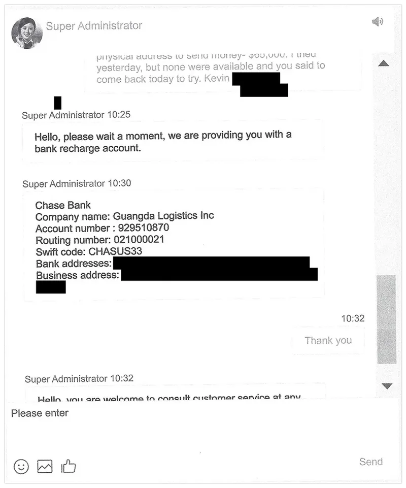 Like many a pig-butchering victim, Kevin realized something was off only when he went to withdraw his profits and 3A demanded that he first pay a “tax” of almost $134,000. Kevin knew from his financial planning days that wasn’t how things worked. But he set aside his doubts and went to his bank late one afternoon in April 2023 to wire the tax payment. He’d been given a fresh Chase account to send funds to and pressured to wire money within two hours.