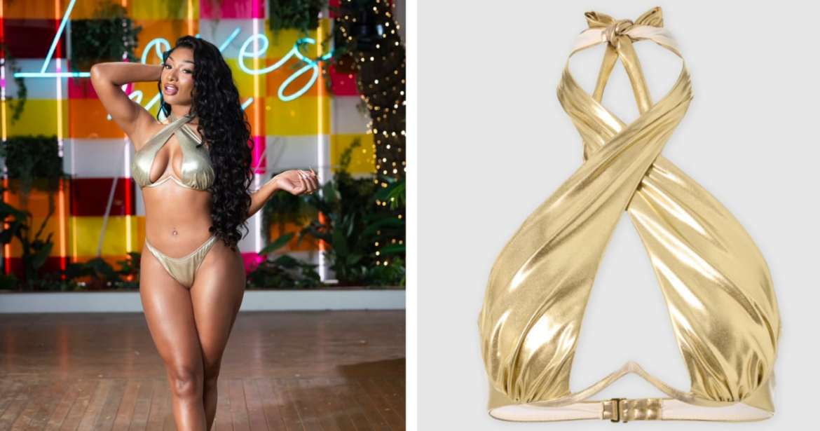 Although we’re still processing the “dump” from episode 20 of “Love Island USA” Season 7, Megan Thee Stallion’s episode still has us obsessed. Given the show’s allure and many steamy moments, it was only right that the “Mamushi” rapper made a guest appearance. During her cameo, the star hosted a three-part challenge, which consisted of a twerking competition, a limbo round, and a puzzle race, which culminated in two new bombshells joining the show. Of course, she wore an ensemble that was sultry enough to match the night’s mischief: a metallic gold two-piece bikini with matching, strappy-heeled sandals and jewelry. But let’s be clear: it’s far from your average bikini; it’s from her very own Walmart swimwear line.