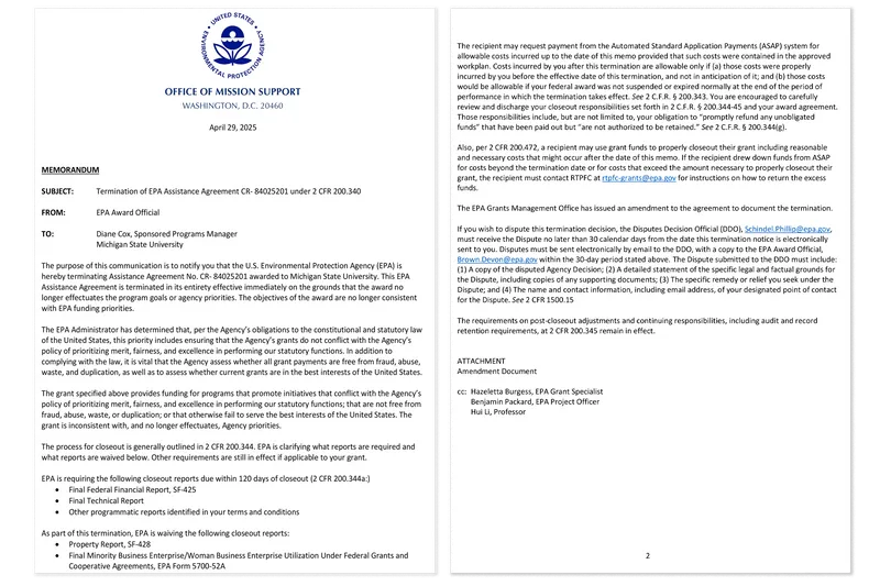 In virtually identical letters, the agency said that each grant “no longer effectuates the program goals or agency priorities. The objectives of the award are no longer consistent with EPA funding priorities.”