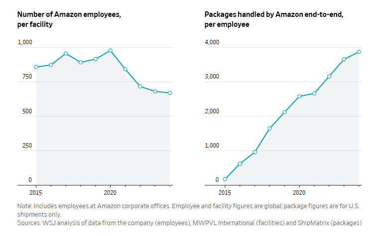 Amazon emploie maintenant presque autant de robots que les personnes, ce qui conduit à d'énormes améliorations de la productivité. Du deuxième diagramme des forfaits “de bout en bout” d'Amazon est passé de 175 en 2015 à près de 4 000 en 2025. Excellente pièce dans le WSJ.