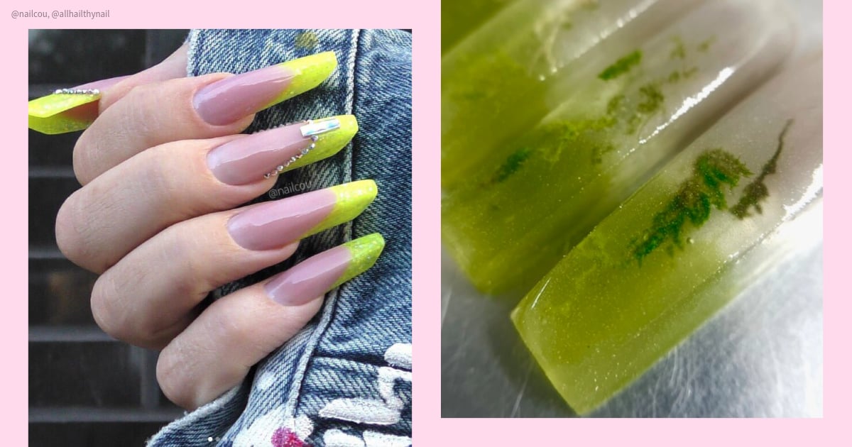 Cube nails are one of Sun’s biggest predictions for 2025 nail trends. “Cube nails are 3D, but they’re shaped in a rectangular prism,” says Sun. That means the entire cube shape runs from the nail bed to the tip, making it easy to encapsulate things inside, such as the moss. Cube nails are the same thickness throughout, she notes.