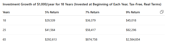 La contribution de l'employeur est importante pour moi. Supposons en plus du paiement initial de 1 000 dollars américains, qui est ajouté à une moyenne de 1 000 $ par an pendant 18 ans (par une combinaison de contributions des employeurs des parents et des parents). Notez que cela est inférieur à la contribution annuelle maximale autorisée de 5 000 $. Avec un rendement historiquement judicieux de 7%, ces comptes âgés de 18 ans à 36 000, 58 000 $ et 875 000 âgés de 65 ans, bien sûr, subordonnés à l'incertitude, comme indiqué ci-dessous.