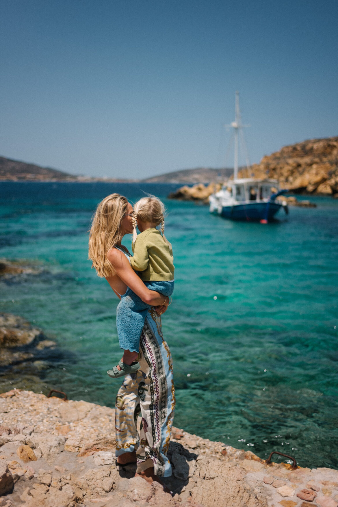 La Grèce a la possibilité de réorganiser leurs sens, les couleurs apparaissent d'une toute nouvelle manière. Le cobalt n'est pas seulement bleu, il est soudainement de la profondeur et du sel et de l'ombre. Et la crème n'est pas neutre, c'est l'os, le plâtre, le dessous d'une feuille de figuier en plein soleil. Ensemble, ils sont la palette que je garde et répète à plusieurs reprises le rythme des îles. Les chromatiques égéennes ne sont pas une tendance. Ils sont une humeur, un souvenir, un moyen de voir. Et pour le moment, ce sont tout ce que je veux porter. Notre première journée complète en Grèce a commencé avec une journée de bateau de 7 heures à Paros. L'eau est une couleur frappante, froide, mais rafraîchissante avec la chaleur estivale. Nous avons navigué et nous nous sommes arrêtés près d'une niche sans vent pour le déjeuner et avons sauté dans l'eau pour se refroidir par la suite. Après que tout le monde ait été étonné du décalage horaire, le swing du bateau nous a lentement collés dans une sieste tranquille avant de retourner à la terre.