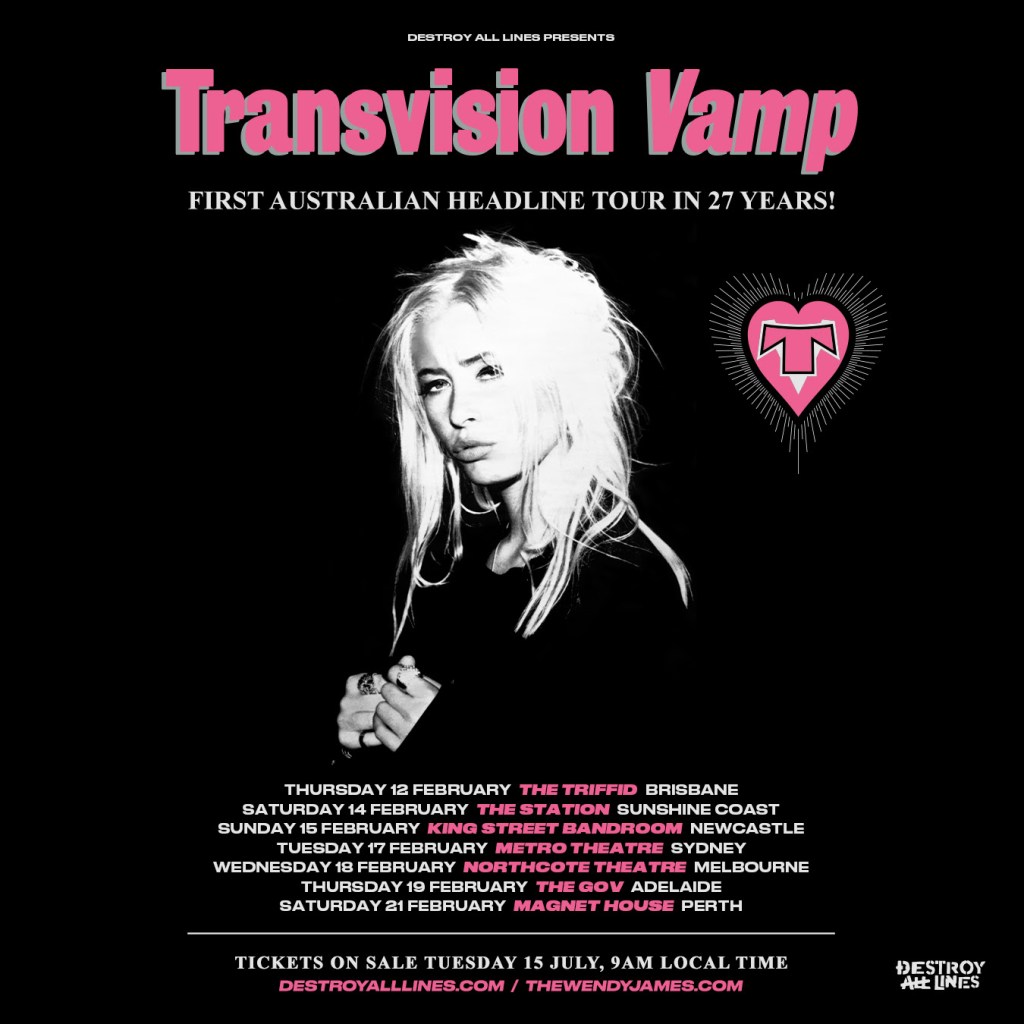 Le groupe britannique de pop rock Transvision Vamp reviendra aux scènes australiennes pour la première fois en près de trente ans en février 2026. Le groupe montre à Brisbane, Sunshine Coast, Newcastle, Sydney, Melbourne, Adelaide et Perth joueront sur la tournée.