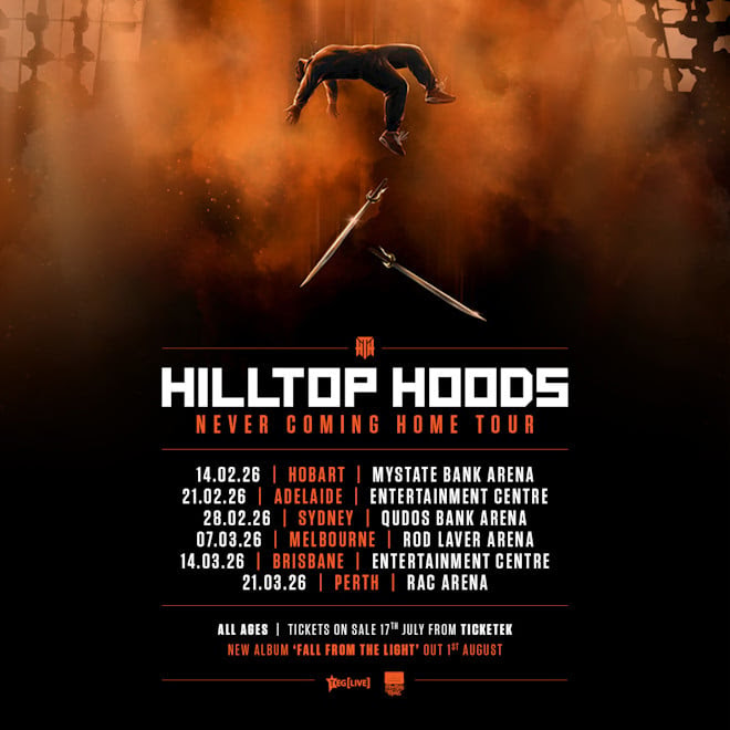 Hilltop Hoods est de retour avec «Never Come Come Home», le premier vrai goût de son prochain album «Fall From the Light», qui se termine le 1er août. Le single montre la six60 de la Nouvelle-Zélande et arrive à grande échelle avec un clip, qui fixe certains des plus grands noms des arts martiaux australiens, y compris le champion du monde de l'UFC Alexander Volkanovski.