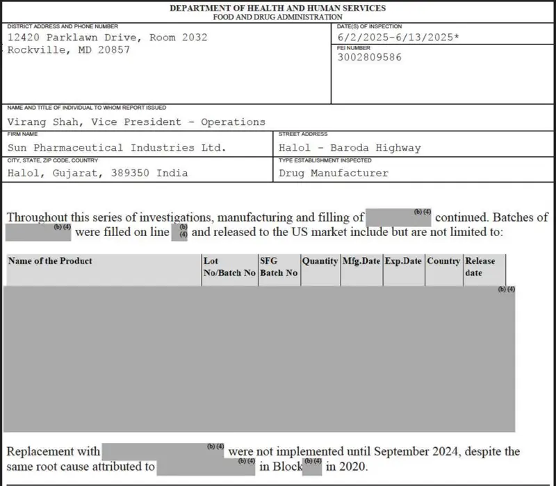 L'inspection du mois dernier a été pour la première fois que la FDA était de retour à l'usine au cours des 2,5 années depuis qu'il a imposé l'interdiction d'importation et le soleil a commencé à envoyer exclusivement des drogues aux États-Unis. Les inspecteurs ont constaté que les procédures de prévention de la contamination microbiologique des médicaments stériles n'étaient pas déterminées ou suivies et que les dispositifs n'ont pas été maintenus pour éviter des dysfonctionnements qui “modifieraient la sécurité, l'identité, la résistance, la qualité ou la pureté du produit médicamenteux”, indique le rapport.