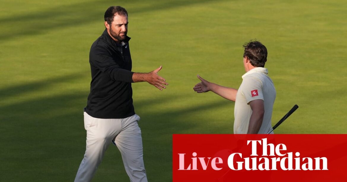 Scottie Scheffler’s drive at 17 looks like heading towards bush-related trouble down the left … but he’s battered it so far that it sails over the bother and into lighter rough past the bank. You make your own luck. Meanwhile up on 18, Harris English can’t convert his fine approach into birdie, and finishes with a round of 68. Bob MacIntyre has to settle for a 70, that eagle on 7 failing to ignite the round he’d have wanted. English is -8, MacIntyre -6. Scotland’s wait for another Open champion, stretching back to Paul Lawrie in 1999, goes on.