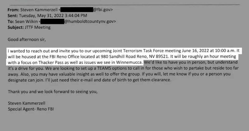 All told, about 10 agencies have monitored the mine’s opponents. In addition to the FBI, those agencies include the Bureau of Land Management, Humboldt County Sheriff’s Office, Bureau of Indian Affairs, Nevada State Police Highway Patrol, Winnemucca Police Department and Nevada Threat Analysis Center, the records show.
