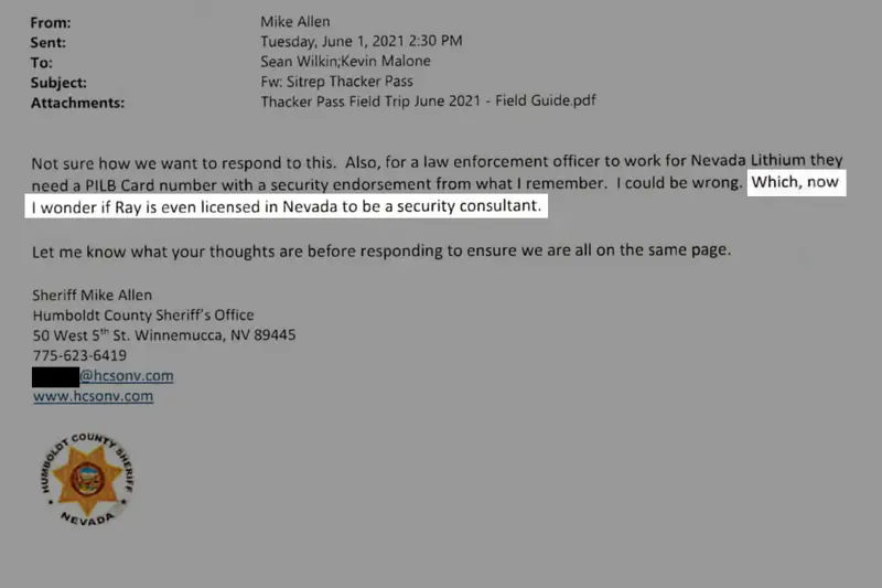 The records show security personnel hired by Lithium Americas speaking as if an uprising could be imminent. “To date, there has been no violence or serious property destruction, however, the activities of these protest groups could change to a more aggressive actions and violent demeanor at any time,” Raymond Mey, who joined Lithium Americas’ security team for a time after a career with the FBI, wrote to law enforcement agencies in July 2022.