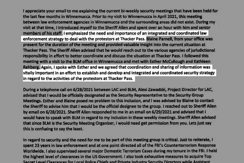 Mey also researched protesters’ activities, sharing his findings with law enforcement. In an April 2021 update, for example, he provided an aerial photograph of the protesters’ campsite. Law enforcement agencies worked with Mey, and he pushed to make that relationship closer, seeking “an integrated and coordinated law enforcement strategy to deal with the protestors at Thacker Pass.” The records indicate that the FBI was open to him attending its joint terrorism task force.