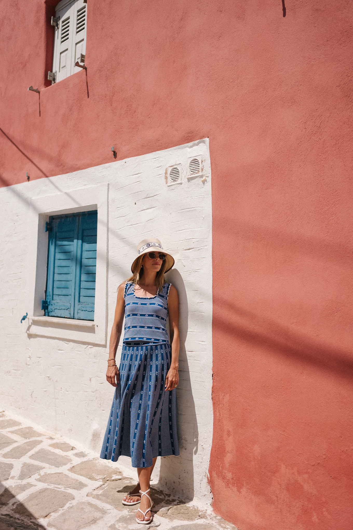 Molli Top & Rock, Valentino -Hut, Margaux Sandals (similaire, ici moins cher), lunettes de soleil Saint Laurent (similaires, moins chères ici)