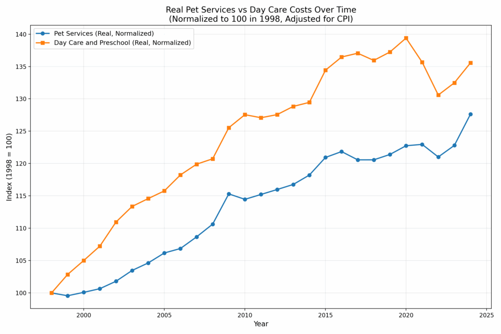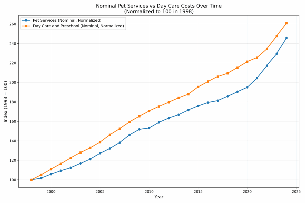 Les soins aux animaux sont moins réglementés que les services de garde, mais il est également soumis à l'effet de Baumol. Comment les tendances des prix se comparent-elles? Êtes-vous radicalement différent ou étonnamment similaire? Voici les deux tendances des prix bruts pour les services d'animaux de compagnie (CUUR0000SS62053) Et pour la garderie (enfants) et la préscolaire (CUUR0000SEEB03). Service de compagnie Couvre l'ordonnance, la garderie, le siège d'animaux, la marche, la formation à l'obéissance, les soins, mais les soins vétérinaires exclu De cette série, il est si comparable à la garde d'enfants.