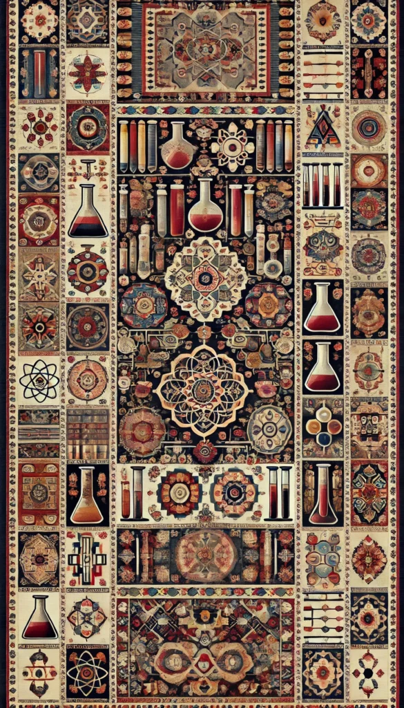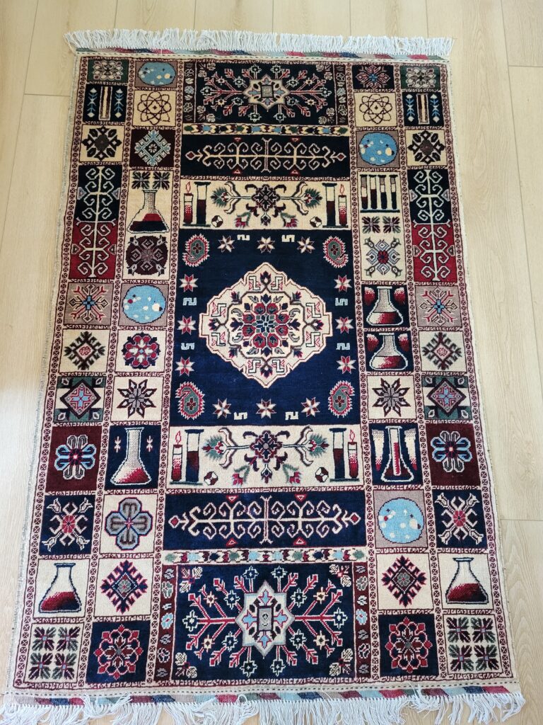Pour mon anniversaire de mariage, j'avais tissé un tapis pour ma femme du microbiologiste à la main en Afghanistan. Le tapis mélange les conceptions traditionnelles de l'Afghanistan avec certains éléments scientifiques, notamment Bunsenbrenner, des tuyaux d'essai, des boîtes de Pétri bactériennes et d'autres éléments.