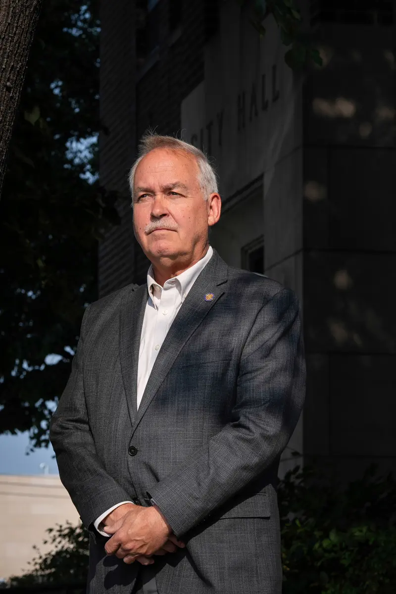 North Dakota state Sen. Brad Bekkedahl, a Republican who is also Williston’s finance commissioner, outside Williston City Hall after a commission meeting in June