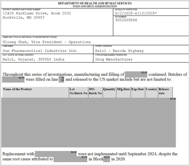 A portion of the FDA’s June 2025 inspection report redacted the names of potentially compromised drugs manufactured by Sun that continue to be released to the U.S. market.