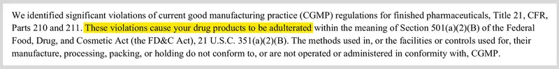 A 2015 warning letter from the Food and Drug Administration to Sun Pharma stated that the agency “identified significant violations of current good manufacturing practice” and that “these violations cause your drugs products to be adulterated.”