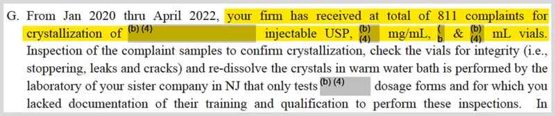 A 2022 FDA inspection report on the Sun factory in Halol, India, notes that “From Jan 2020 thru April 2022, your firm has received a total of 811 complaints for crystallization of” injectable vials of a medication whose name was redacted. The report says sample testing was performed by a sister company for which Sun “lacked documentation of their training and qualifications to perform these inspections.”