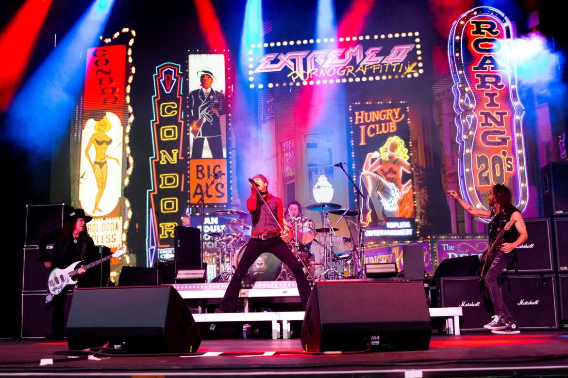 Lorsque le soleil commence sur l'emplacement de l'événement à couper le souffle, un énorme visage de gorille remplit l'arrière-plan sur la scène et dessine diverses expressions pendant que la musique commence à construire. Nuno Bettencourt, qui se tient devant un mur d'amplificateurs Marshall C'est un monstre)«Ce qui frappe aussi dur aujourd'hui qu'il y a 35 ans. Gary Cherone saute et nous sommes exposés à une ruée implacable pour les 10 prochaines minutes avec de la musique ancienne et nouvelle. Dance de décennie Exécute directement dans “#Rebel” de son dernier album.