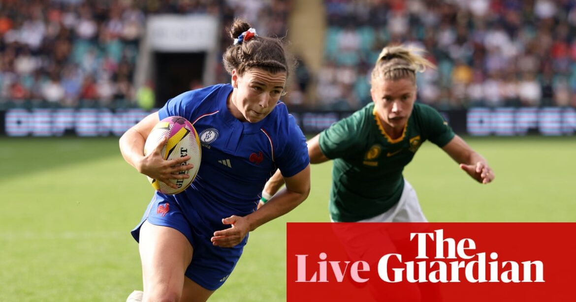 33 min: Hele picks up off the back of a scrum and charges. Roos offers support. South Africa’s ball retention is good but they can’t go anywhere in the face of stiff French defence. They’re also missing a player in the backline now that Qawe has been red carded. They’re pushed backwards but have the ball. Webb and the Dolf have darts. The whistle sounds as Ngingolo is sitting down injured. South Africa will get the scrum but they don’t want to lose a prop.They won’t. After some treatment she jogs back her mates and prepares to pack down.