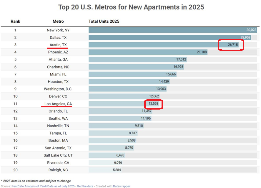John Arnold fait référence à ce tableau à de nouveaux appartements et se rend compte que la population de LA (18,5 m) est plus de 7 fois celle d'Austin (2,5 m).