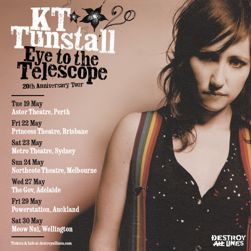 KT Tunstall a repris en mai 2026 pour célébrer deux décennies de son premier album révolutionnaire Œil sur le télescope. Le disque multi-platine, qui vous a transformé d'un auteur-compositeur-interprète culte en une star mondiale, est complètement réalisée dans une série de spectacles exclusifs à travers l'Australie et la Nouvelle-Zélande.