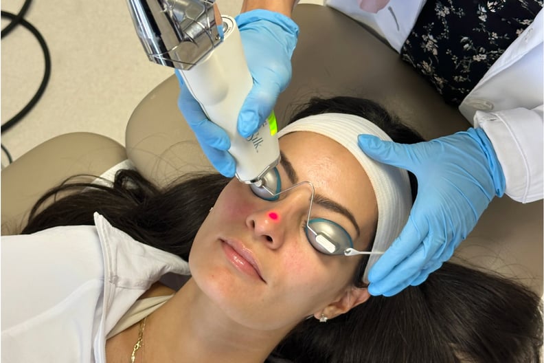 One of the things I love about the ClearSilk laser is that it’s quick, gentle, and doesn’t require any numbing (sensitive skin, rejoice!). Before the treatment, I was instructed to remove all of my face makeup and put on a pair of safety goggles. The machine goes up to level seven (I started with a level two on my first session, and by the fourth session, I was on level six). Aside from a little bit of a heated zap, I remained comfortable throughout the entire 10-minute treatment and didn’t feel any pain. Of course, the higher the settings, the spicier it’ll feel, but the good news is that the machine is able to detect body temperature and will signal if it gets past 107 degrees Fahrenheit. One thing to note: If you have any fine hairs on your face, you may feel more heat and experience a burning smell as the hair absorbs the heat of the laser on those areas.