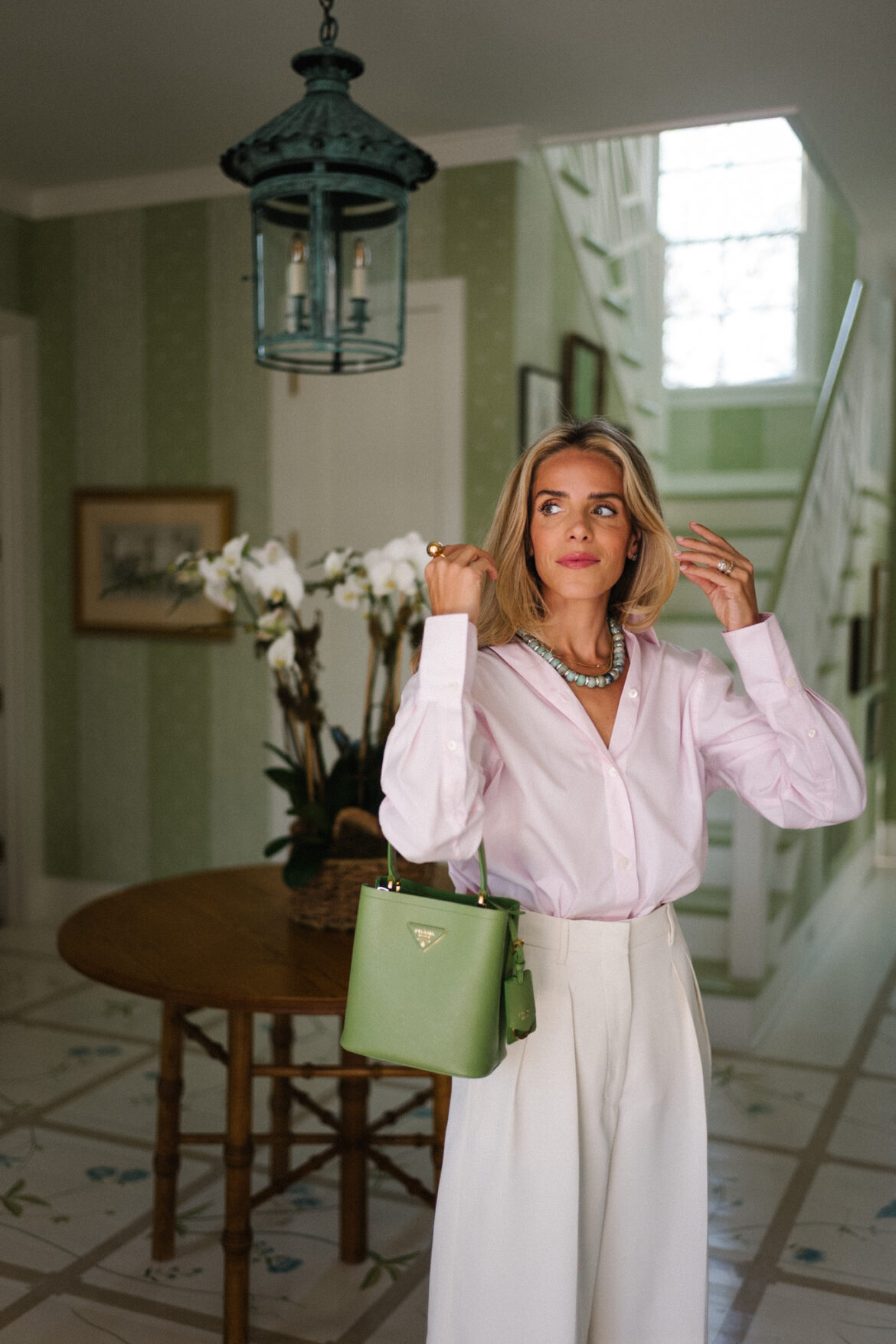 Chemise totem, pantalon altuzarra, plats prada, sac prada