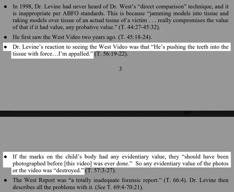“When I testified in this case, I believed in the uniqueness of human bite marks. I no longer believe that,” West said during a deposition when a defense attorney asked if he was still confident in his analysis of bite marks. “And if I was asked to testify in this case again, I would say I don’t believe it’s a system that’s reliable enough to be used in court.”