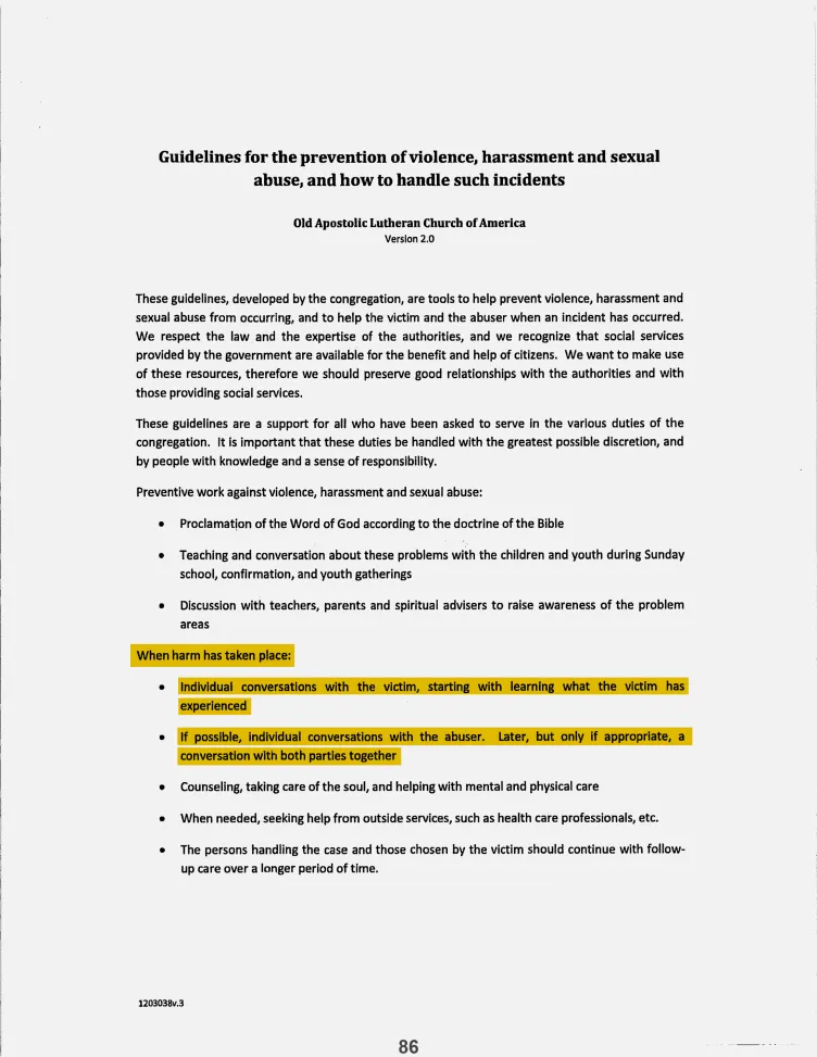 Bruckelmyer also told police his actions followed church protocol. An internal church document, obtained by the Star Tribune and ProPublica, suggests that, when appropriate, church leaders and others facilitate “a conversation with both parties together” — an action that experts who work with abuse victims say can add to a victim’s trauma. While the document praises the police and the justice system, it doesn’t mention mandatory reporting laws and gives preachers wide latitude on whether to involve police.