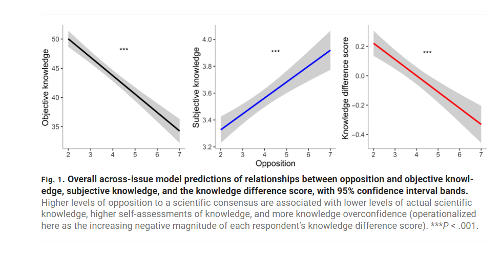 Les auteurs mettent ensuite en corrélation les évaluations des connaissances objectives (non controversées) des personnes interrogées avec leur rejet du consensus scientifique sur des sujets tels que la vaccination, l'énergie nucléaire et l'homéopathie. Le résultat est frappant : les personnes les plus anti-consensus (7, tout à droite sur l’axe horizontal dans la figure ci-dessous) obtiennent de moins bons résultats en matière de connaissances objectives mais affichent une confiance subjective plus élevée. En d’autres termes, les opposants au consensus sont les plus susceptibles de se tromper : l’écart entre ce qu’ils savent et ce qu’ils pensent savoir est le plus grand.