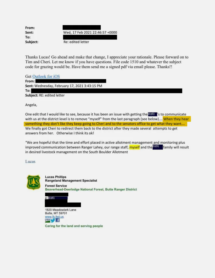 “If this issue was solely between the [ranger district] and the permittee, we should administer the permit and end the discussion there,” wrote one Forest Service official in 2020. “Unfortunately, we have regional, state and national oversight from others that deters us from administering the permit like we would for others. It is very unfair to the top notch operators that call/coordinate/manage consistently. But, what the [ranchers] perceive as picking on them, for political reasons, has become a mandate that we make accommodations outside the terms of a mediated permit. So be it.”