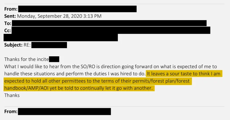 Another agency official wrote, “It leaves a sour taste to think I am expected to hold all other permittees to the terms of their permits/forest plan/forest handbook … yet be told to continually let it go with another.”
