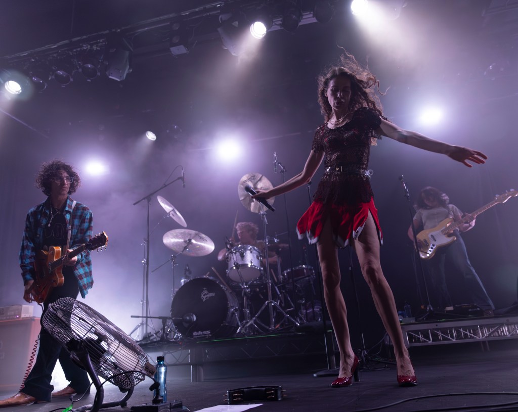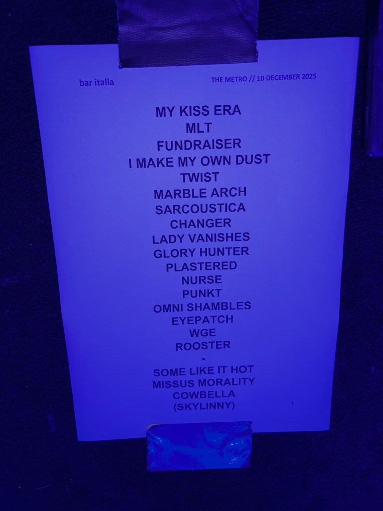 La foule de ce soir est pleine de gens beaux, calmes et vêtus de jeans, le genre de gens qui ont l'air d'être nés dans une pochette de disque. Et Bar Italia les rencontre exactement là où ils veulent être récupérés : à moitié distants, à moitié explosifs. Ils ont parcouru un long chemin depuis la présence timide, presque fantomatique, que j'ai vue dans ce décor sombre de l'Oxford Art Factory l'année dernière, où ils ont à peine reconnu la pièce avant de disparaître dans la nuit. Aujourd'hui, après 160 concerts sur tous les continents, ils montent sur scène comme un groupe qui sait ce que signifie son nom. Vous avez des muscles. Vous avez du fanfaronnade.