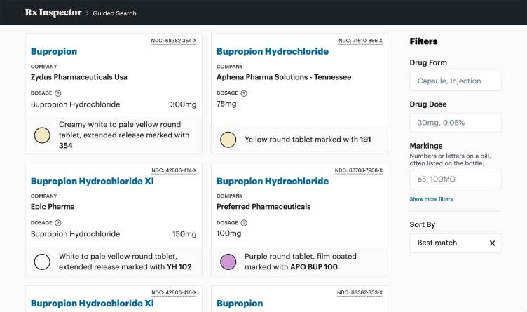 Par exemple, vous pouvez saisir le nom de votre médicament et toute information figurant sur l'étiquette de vos flacons de pilules concernant l'entreprise qui a pu le fabriquer. Si vous n'avez pas de nom d'entreprise, vous pouvez saisir la couleur de vos pilules ou toute marque dessus, des détails qui peuvent vous conduire à des informations sur votre médicament spécifique. À partir de là, vous pouvez connaître le nom du fabricant réel (et non de l’entreprise qui l’a simplement reconditionné ou distribué). Et vous pouvez également voir l'adresse de l'usine où il a été fabriqué.