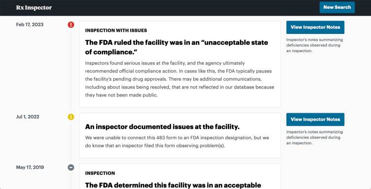 Enfin, cette application vous permet d'en savoir plus sur les fabricants de médicaments dans leur ensemble en recherchant leurs usines. En saisissant le nom d’une entreprise, vous pouvez voir quand ces usines ont été inspectées pour la dernière fois et si la FDA a pris des mesures ces dernières années.