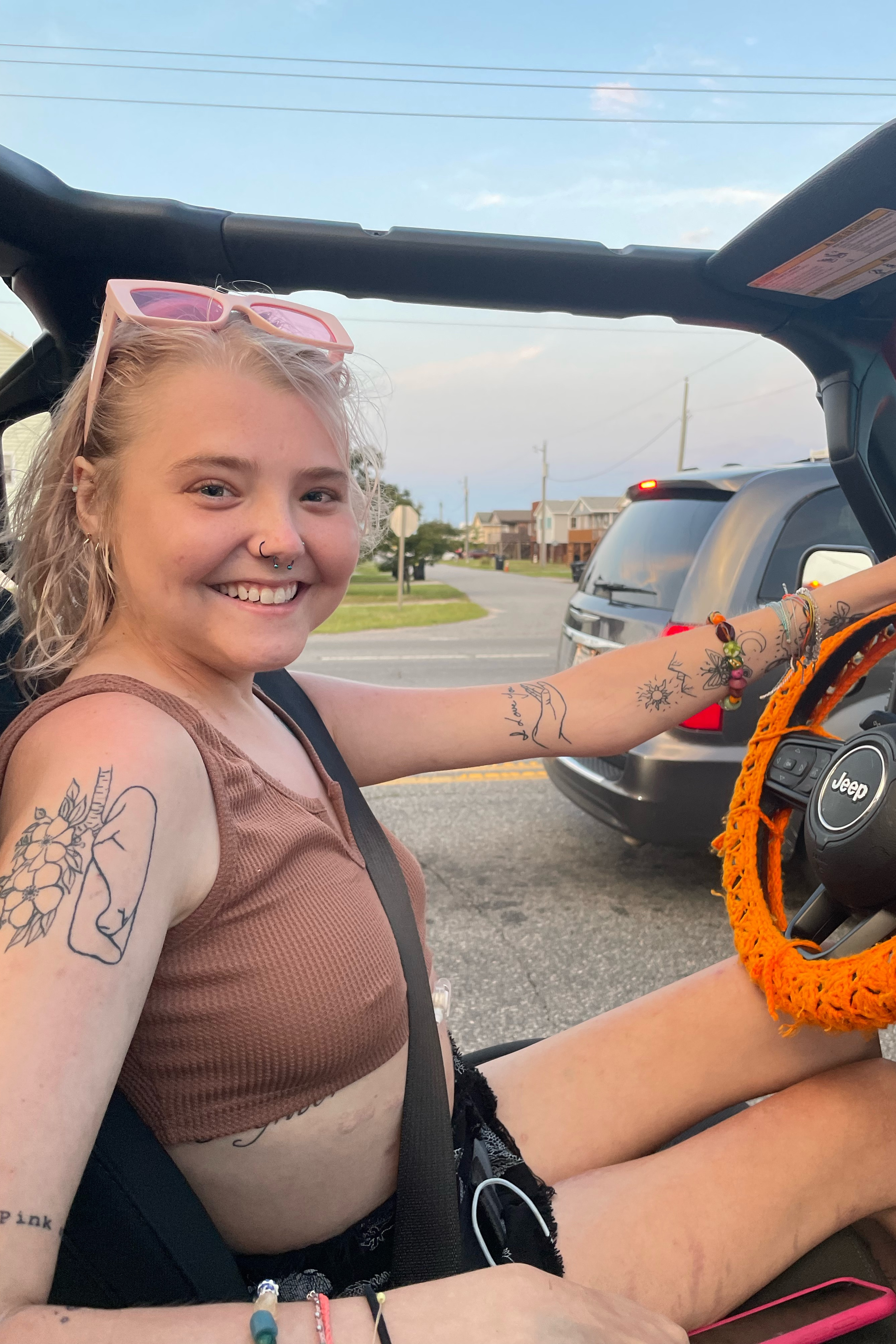 Hannah celebrated her “lungiversary” one year by taking the roof and doors off her orange Jeep and convincing her cousin to get matching Saturn and moon tattoos.