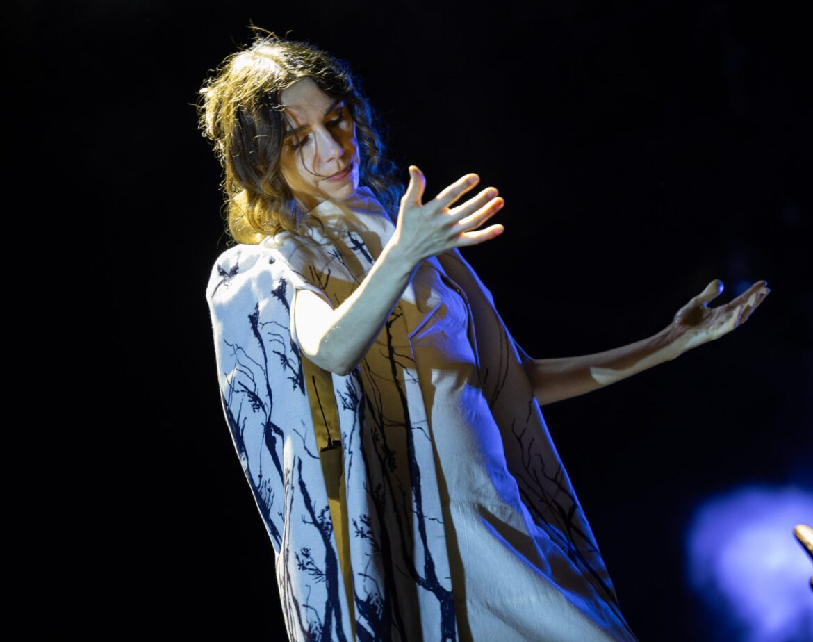 Une pleine lune est suspendue sur Sydney et illumine l'opéra – fantomatique, monolithiquement contre la nuit. La scène est clairsemée: quelques chaises en bois, une table surpeuplée de lunettes, un bureau, le quelque peu contemplatif, quelque peu rituel. PJ Harvey apparaît dans ce tableau, une figure spectrale en blanc, sa robe et son manteau, qu'elle a l'air à la fois tendre et inébranlable, comme quelque chose d'un vieux daguerréotype. Elle ne parle pas. Elle n'a pas à le faire.