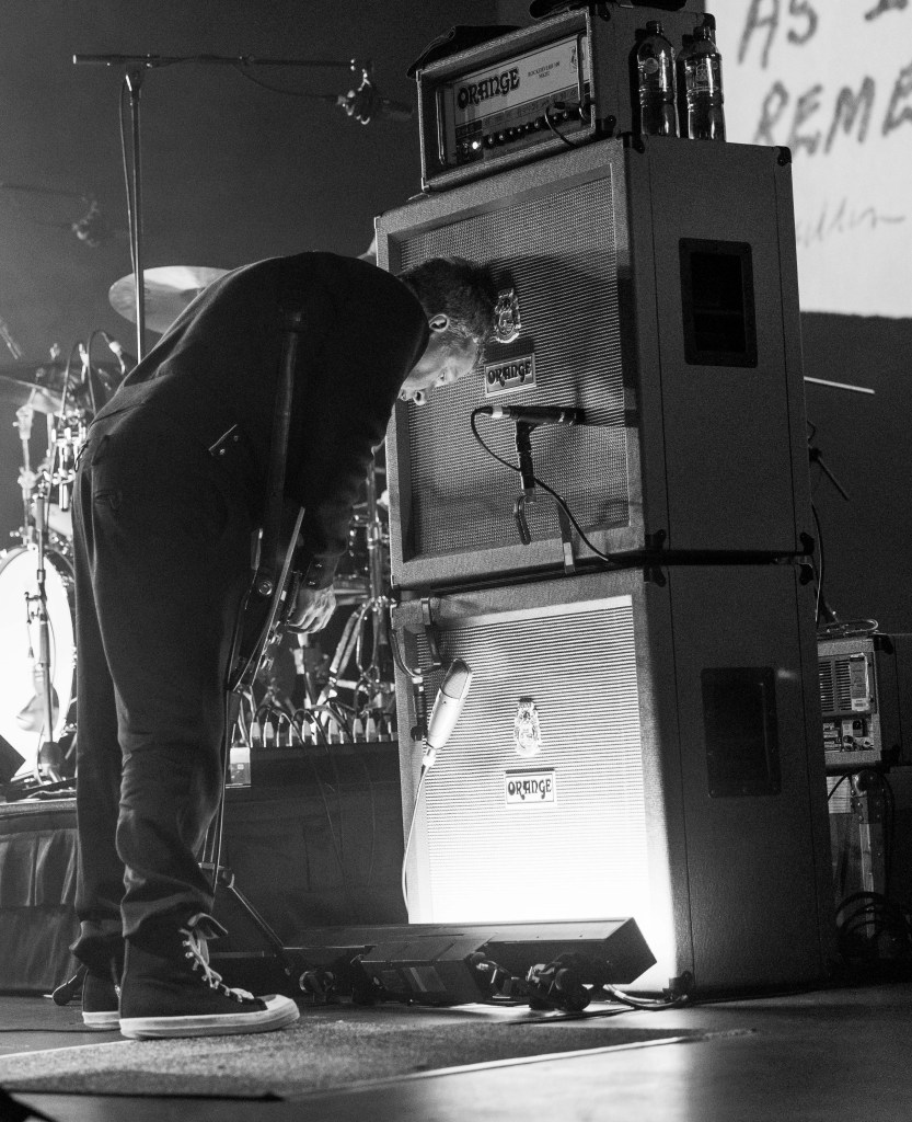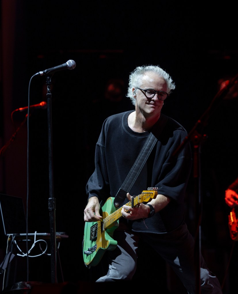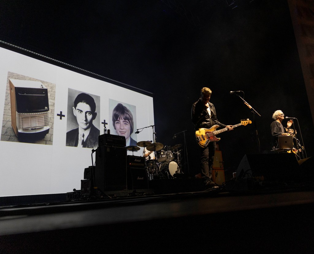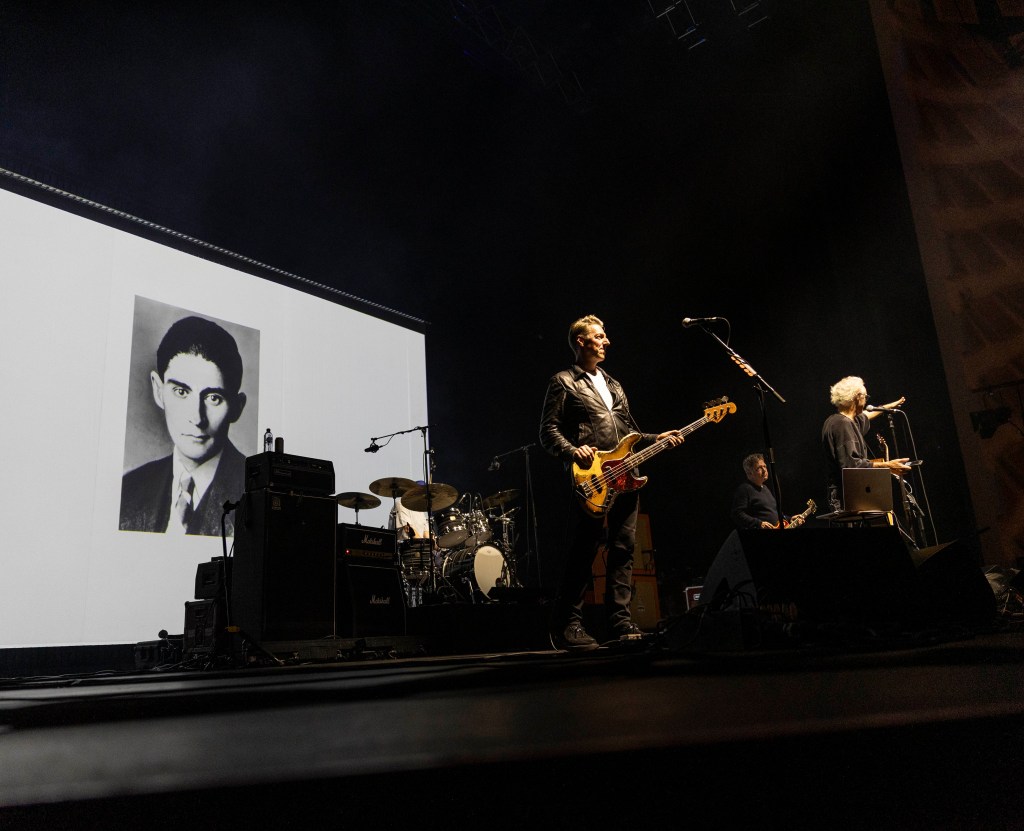 Alors qu'ils entrent sur scène, Travis se jette immédiatement en l'air Écrivez pour vous joindreavec Andy Dunlop tombant à genoux pour lutter contre un solo de guitare irrégulier, le moment traversant le glamour du théâtre avec une rudesse bienvenue. Fran Healy, les cheveux sauvages et les yeux brillants, ressemble tout à fait au professeur distrait et fou alors qu'il interrompt le cours pour expliquer que ce soir n'est pas seulement une performance, mais une performance guidée : une présentation PowerPoint conçue pour montrer comment ces chansons sont nées. Soudain, nous sommes transportés dans un appartement glacial de Glasgow en décembre 1995, avec Kafka à la main et Healy essayant de procéder à une ingénierie inverse. Mur des Merveilles Une photo de Noel Gallagher clignote à l'écran alors qu'il explique le tournage de Écrivez pour vous joindre.