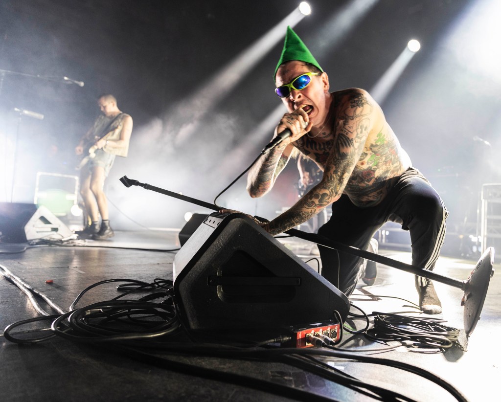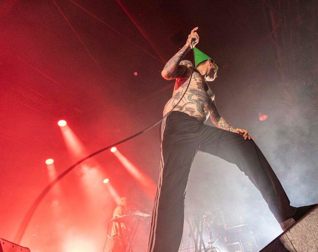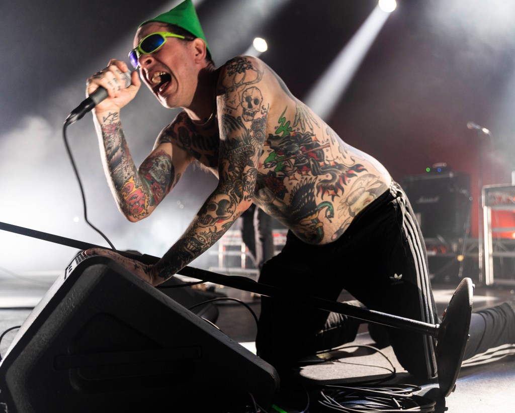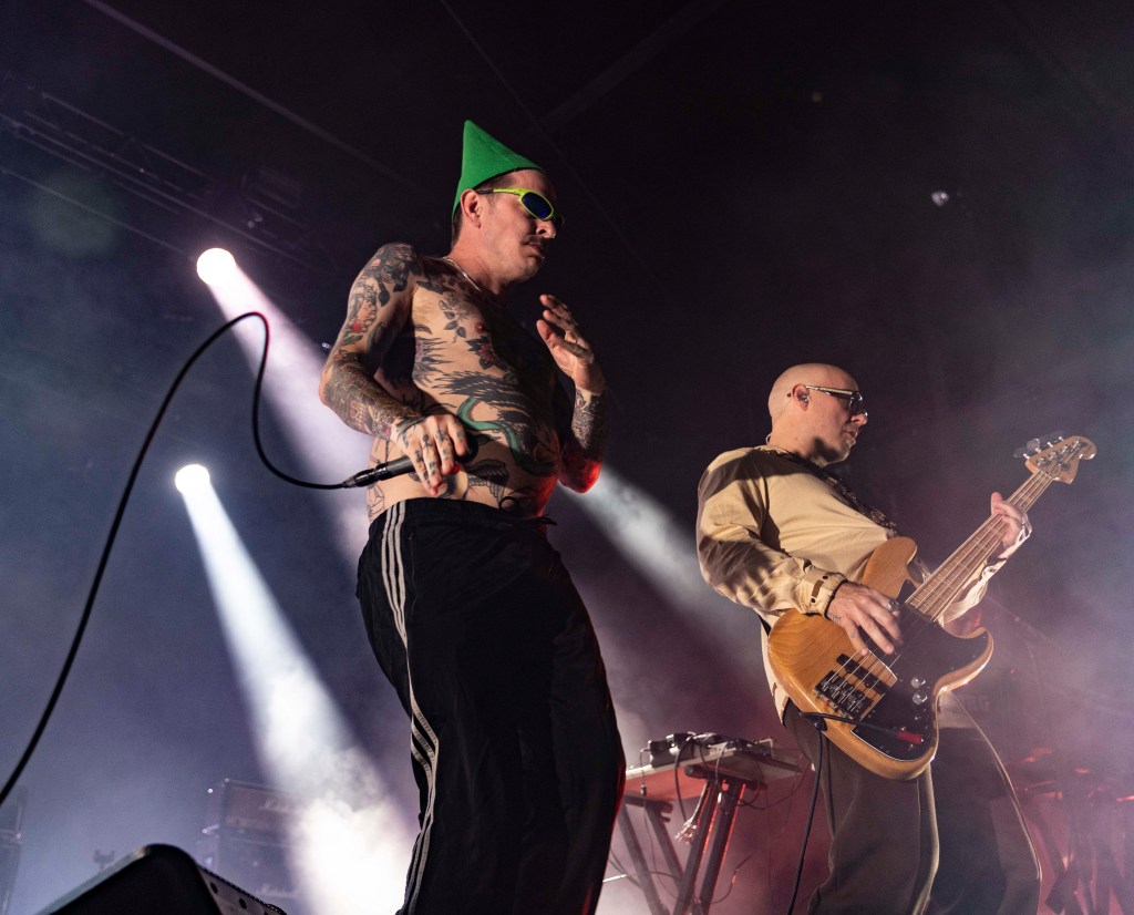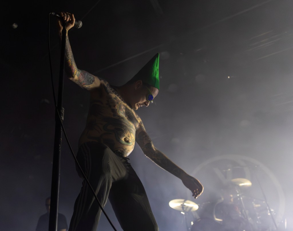 À l'époque Les gars du Viagra Quand on entre sur scène, la salle est déjà trempée, physiquement et émotionnellement. Leader Sébastien Murphy arrive en pantalon de survêtement, torse nu, chapeau conique vert vif, ventre de bière et tatouages, ressemblant moins à un leader qu'à un homme tiré directement de la foule – et pourtant complètement en contrôle. Il se déplace comme un maître de piste grotesque, parcourant la scène avec une aisance conflictuelle et transformant son corps en une partie de la satire. Entre monologues grognants et voix grinçantes, Murphy s'insurge contre l'autoritarisme, la paranoïa et les postures machistes, et embroche le sectarisme avec des quantités égales de bile et d'humour. Malgré le chaos, le groupe reste brutalement ensemble, combinant explosions de saxophone et grooves industriels en quelque chose d'étrangement discipliné – une performance qui se nourrit d'inconfort, de confrontation et de contrôle et atterrit exactement à sa place.