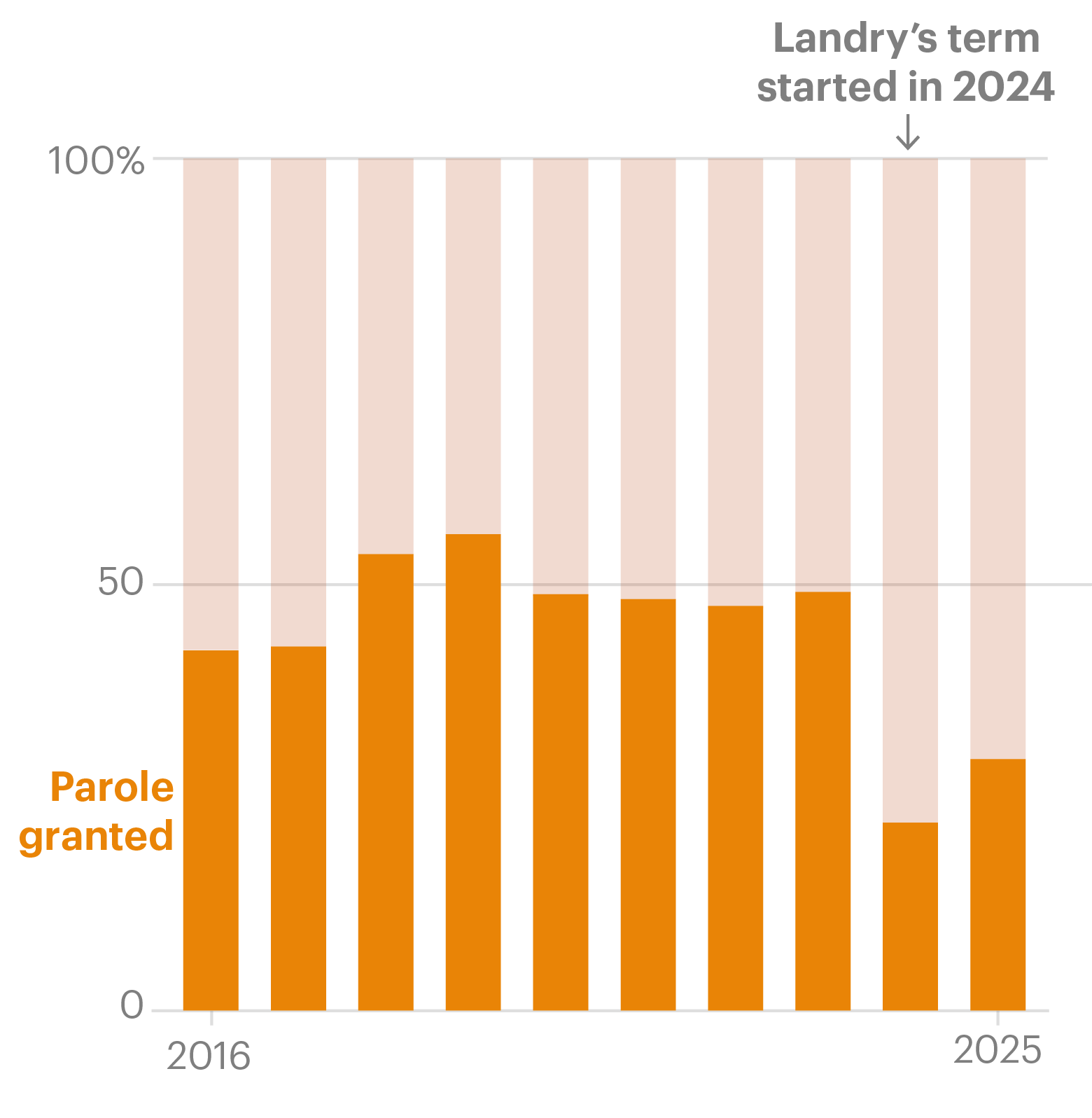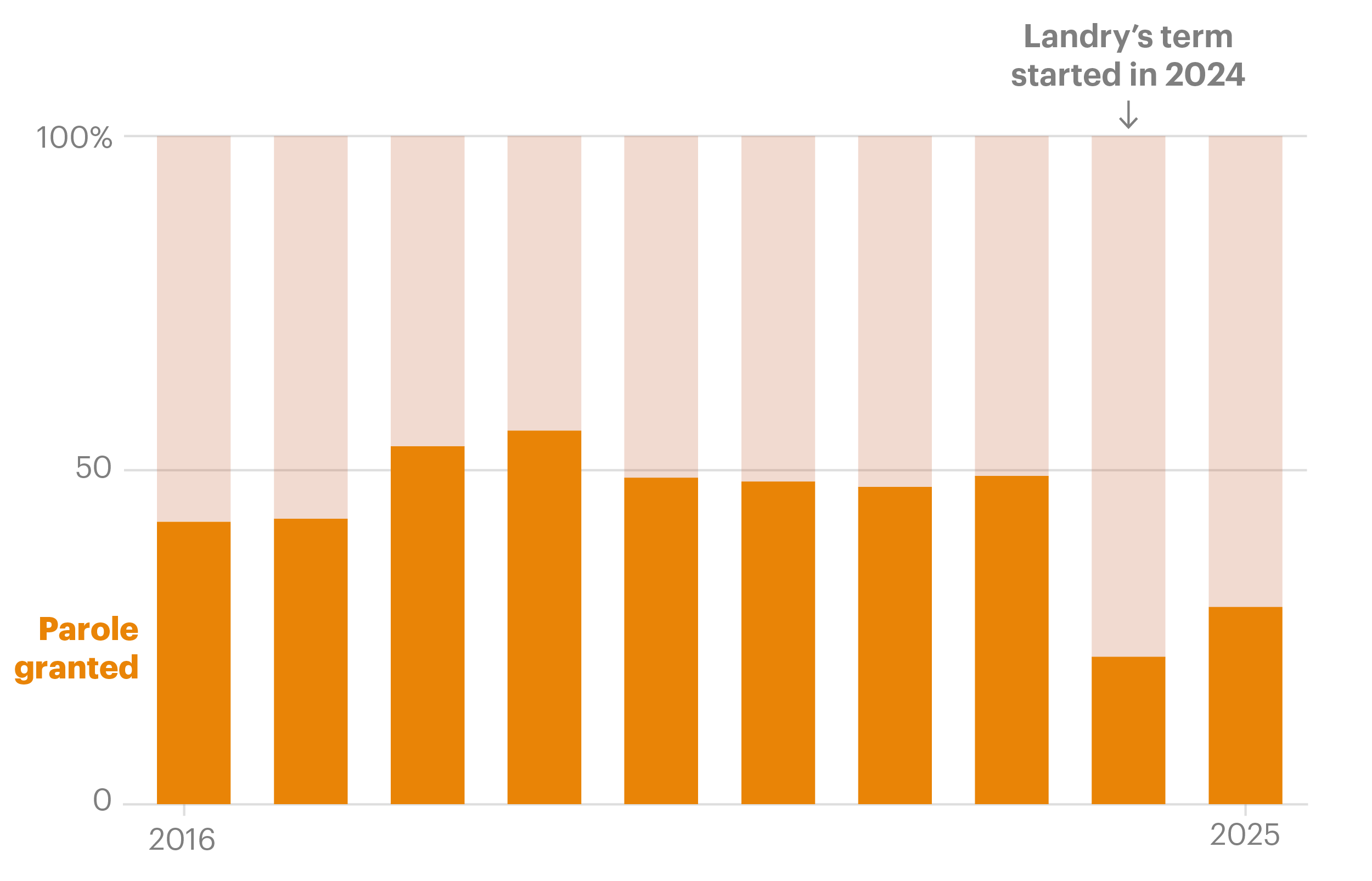 Overall, during Landry’s two years in office, just over a quarter of those eligible have been paroled compared with about half the prisoners who appeared before the parole board prior to his inauguration, according to annual parole rates.